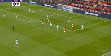 对阵曼城的第一个进球,当然是来自本方半场防下的任意球,但你要注意看到的是,在布鲁诺带球快速向前的路上,多尔古、姆贝乌莫和阿玛德-迪亚洛全部都在冲刺: